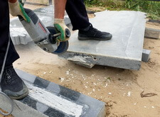 Затем переходим к установке памятника: аккуратно принесли гранитное надгробье на могилу, далее по месту распилили каменные балки, из которых в дальнейшем и собирается цветник. Параллельно в памятнике проделываем отверстия для насадки на штыри, которые обеспечат наиболее эффективный крепёж.