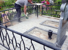 В заключении укладываем на территорию участка брусчатку, предварительно застелив место захоронения геотекстилем. Уложенные в периметр могилы плитки засыпаем пескобетонной смесь, позволяющей наиболее эффективно закрепить покрытие на земле.