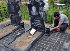 Когда брусчатка подсыхает, переходим к декорированию памятников. У каждого надгробья устанавливаем траурную урну для цветов, изготовленную из чёрного гранита.