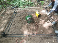 Первым этапом работ будет создание добротного фундамента. Для этого мы вкручиваем четыре металлические сваи, к которым привариваем арматурный каркас.