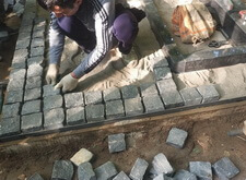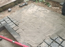 Засыпаем брусчатку пескобетоном, снимаем лишний слой, замываем.