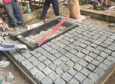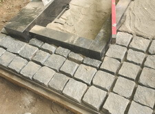 Начинаем укладывать брусчатку, параллельно монтируя цветник из гранитных балок. Кое-где целые квадратики не помещались, поэтому нам приходилось распиливать существующую брусчатку на более мелкие части.