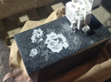 Изготавливаем вазу, наносим изображение. Перед памятником делаем небольшую площадку под траурную урну. Лавочка, установленная на участке, изготовлена полностью из металла. Торцы прямоугольных труб закрыты заглушками, которые надёжно защищают полости от проникновения влаги в период с осени до весны.