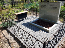 Следующим этапом в работе с могилой стала установка нового памятника, выполненного из светлого гранита и рассчитанного на двух покойных. Плиту доставили на кладбище практически сразу после изготовления, так что надпись пришлось делать уже по месту. Впрочем, на качестве работы это не коим образом не отразилось.