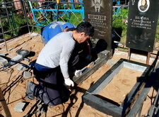Дождавшись, пока покрытие высохнет, мы приступили к последней фазе работы. В цветники и специальную нишу, которую по желанию клиента не стали закладывать брусчаткой, засыпали мульчу. После этого протёрли памятники и ограждение. Могила готова, заказчик остался нами доволен.