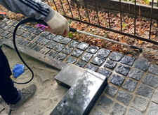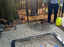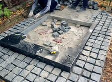 Приступаем к созданию наземного покрытия. По просьбе клиента в центре участка будет находиться широкий цветник, остальную же территорию предполагается замостить гранитной брусчаткой. Засыпаем геотекстиль пескобетонной смесью и укладываем брусчатку, параллельно монтируя цветник из гранитных балок.