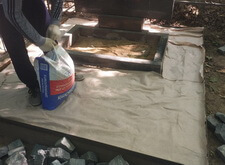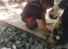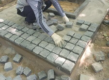 Засыпаем пескобетонную смесь, укладываем брусчатку.