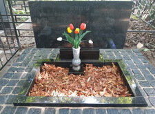 В заключении покрываем надписи на памятнике акриловой краской. Если присмотреться к фотографиям помытого участка, можно увидеть, что текст на надгробье практически не читаем. После окрашивания надпись сохранит свою чёткость в любую погоду. Проведя данный комплекс работ мы сдали объект.