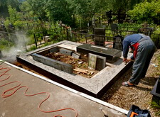 Приступаем к работе с цветниками. Один уже был в наличии, поэтому делаем второй, идентичный. По проекту цветники должны смотреться одинаково даже несмотря на то, что памятники будут разные. В это же время укладываем гранитную брусчатку уже на территорию места захоронения.