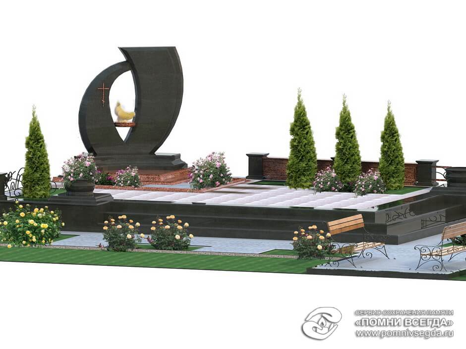 Реализация двойного мемориального комплекса на очень большой площади. Такие размеры участка в Москве и области для большинства просто недостижимы. Создать удачную композицию на такой площади не просто. Необходим комплексный подход. Важно правильное сочетание свободного пространства и композиции с акцентами внимания.
