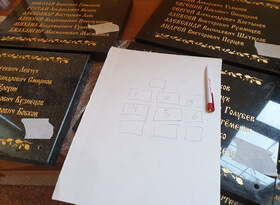 После небольшого совещания, было решено изготовить новые таблички из гранита. Помимо этого мы, с согласия заказчика, увеличили размер букв и изменили шрифт на тот, который я называю «в православном стиле». Обговорив детали и украшающий орнамент, мы изготовили несколько трафаретов для дальнейшей гравировки.